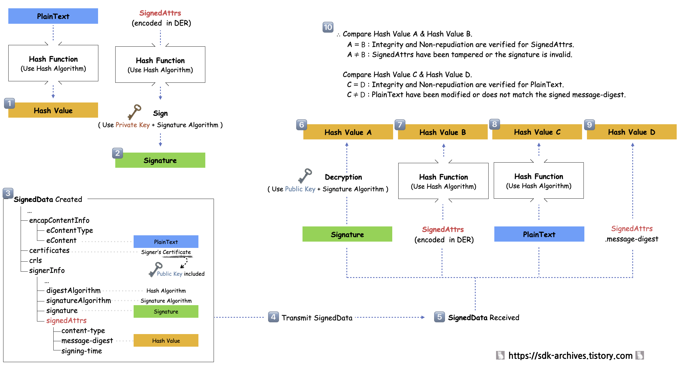 앞서 설명한 SignedData의 생성 및 검증 과정을 보다 직관적으로 이해할 수 있도록 5. SignedData 생성 및 검증 절차를 도식화하여 설명한다. 각 방식은 SignerInfo > signedAttrs 필드의 존재 여부에 따라 서명 생성 및 검증 방식이 다르게 동작하므로 유의한다.
